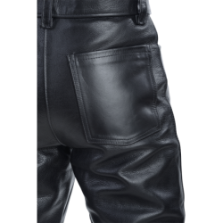 These are classic low-rise jeans, with traditional long belt loops to fit a substantial 2" wide belt set over the waistband. Extra-long legs can easily be trimmed to fit and are cut in large one-piece panels. Two front hand pockets and two rear patch pockets follow the West Coast look of the 60's. The lining is rayon for comfort, and can easily be pulled out of the legs for hand washing. Even if you've never been to El Paso, you'll appreciate the look, craftsmanship and long-lasting performance of these beautiful leather jeans.