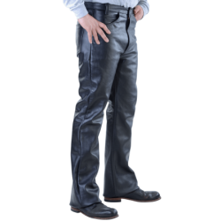 The result is a pair of pants that can move comfortably anywhere, whether on the bike or downtown. The legs are cut in one piece, from the middle of the hide, and supplied extra-long so they can be trimmed to fit exactly. The comfortable rayon lining may easily be pulled out for hand washing; the belt loops will take a two-inch belt and, as with denim jeans, there is a small watch pocket on the right.