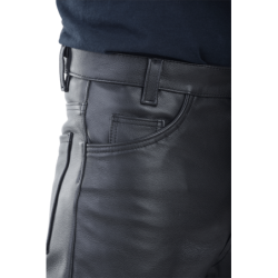 The result is a pair of pants that can move comfortably anywhere, whether on the bike or downtown. The legs are cut in one piece, from the middle of the hide, and supplied extra-long so they can be trimmed to fit exactly. The comfortable rayon lining may easily be pulled out for hand washing; the belt loops will take a two-inch belt and, as with denim jeans, there is a small watch pocket on the right.