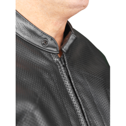 BLACK REVOLUTION COMPETITION WEIGHT LEATHER SOLID BODY WITH PERFORATED LEATHER FRONTS Full weight 1.4 mm (3.50 to 3.75 oz) competition leather. Revolution is the leather of choice when you really need protection on or off the track. We have been making jackets and racing suits out of this leather for over 40 years. It works. And it lasts. With minimal care it lasts a long time. We repair and maintain garments over 30 years of age regularly. It is as simple as that. BLACK PERFORATED REVOLUTION COMPETITION WEIGHT LEATHER Full weight 1.4 mm competition leather is perforated to allow airflow. Perforations also make the leather softer and less firm. Revolution is the leather of choice when you really need protection and abrasion resistance. PERFORATED leather is used on the front AirCurtain Vents.