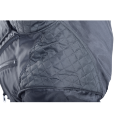 You get to the show and people are noticing your vest. The shoulder padding is obviously hand quilted and top stitched. The front looks all business with the four pockets and hand quilted wind-proof applied windflap. So you give in and show the admirers the hi-vis inside lining with the reflective material worked into the custom embroidery design... The trick Media Pocket with wire pass-through in the upper left chest area gets a special mention. Neat zip-off sleeve-storage pockets, air gauge and pen holder strip, and the twin inner large capacity storage pockets round out the tour. What you did not show them is the secret pocket-in-a-pocket feature in which you have your stash...