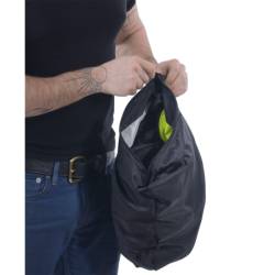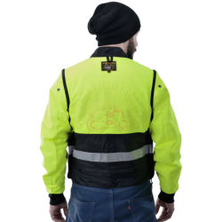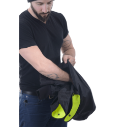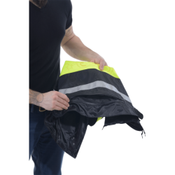It is night, you are on Route 3, a busy road, some shoulder, and you have a flat tire. You take your Streamliner off, reverse it so the safety hi-vis lining and reflective strips show in the headlights of oncoming traffic. Because the Streamliner is designed to be fully reversible you can zip close the front zipper and windflap system either the reflective hi-vis side or the four pocket front side out. In one of the two zip-closed chest pockets you have an LED flashlight...