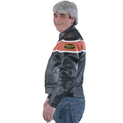 It's a proper, uncompromising Sportrider jacket, stripped-down to the basics but armor-ready, and with the adjustable suede waist. Plain front and sleeves, and a Harley-Davidson orange flat-track inlay around the chest and biceps. Very traditional, very protective.