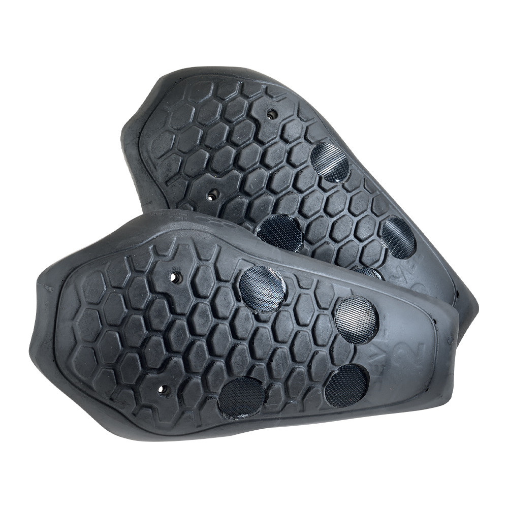 The concept of this system is to both disperse and absorb the force of repeated impacts while providing the best protection. In order to achieve this, it is important that the elbow armor remain in the proper position relative to the body and not shift even during a crash. To best achieve this the foam pad becomes an acute shape cradling the armor inside the curve and holding the CE armor snugly against the riders' body.