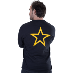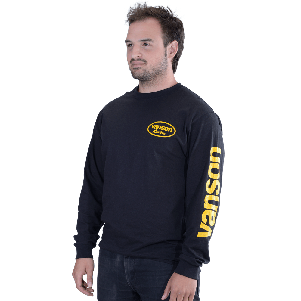 This is the T-shirt interpretation of the Vanson Star racing jacket we have made since the 1970s.The legendary Vanson Star is screened on the back. The left front has the Vanson Competition Oval. Just like the famous Star jacket, both sleeves have "vanson" printed on them. On white shirts, in black, on black shirts, in yellow. This is the kind of shirt flat track racers wear. (Well, the ones who can read). How about you?