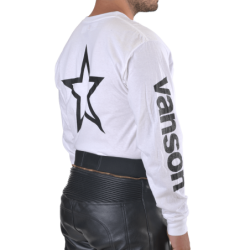 This is the T-shirt interpretation of the Vanson Star racing jacket we have made since the 1970s.The legendary Vanson Star is screened on the back. The left front has the Vanson Competition Oval. Just like the famous Star jacket, both sleeves have "vanson" printed on them. On white shirts, in black, on black shirts, in yellow. This is the kind of shirt flat track racers wear. (Well, the ones who can read). How about you?