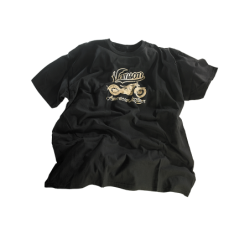 This is a cotton shirt, available in both women's and men's sizes, in olive and in black.Discharge-printed on the front is the Vanson script logo above an image of a vintage V-twin bike, below which "American Leather".