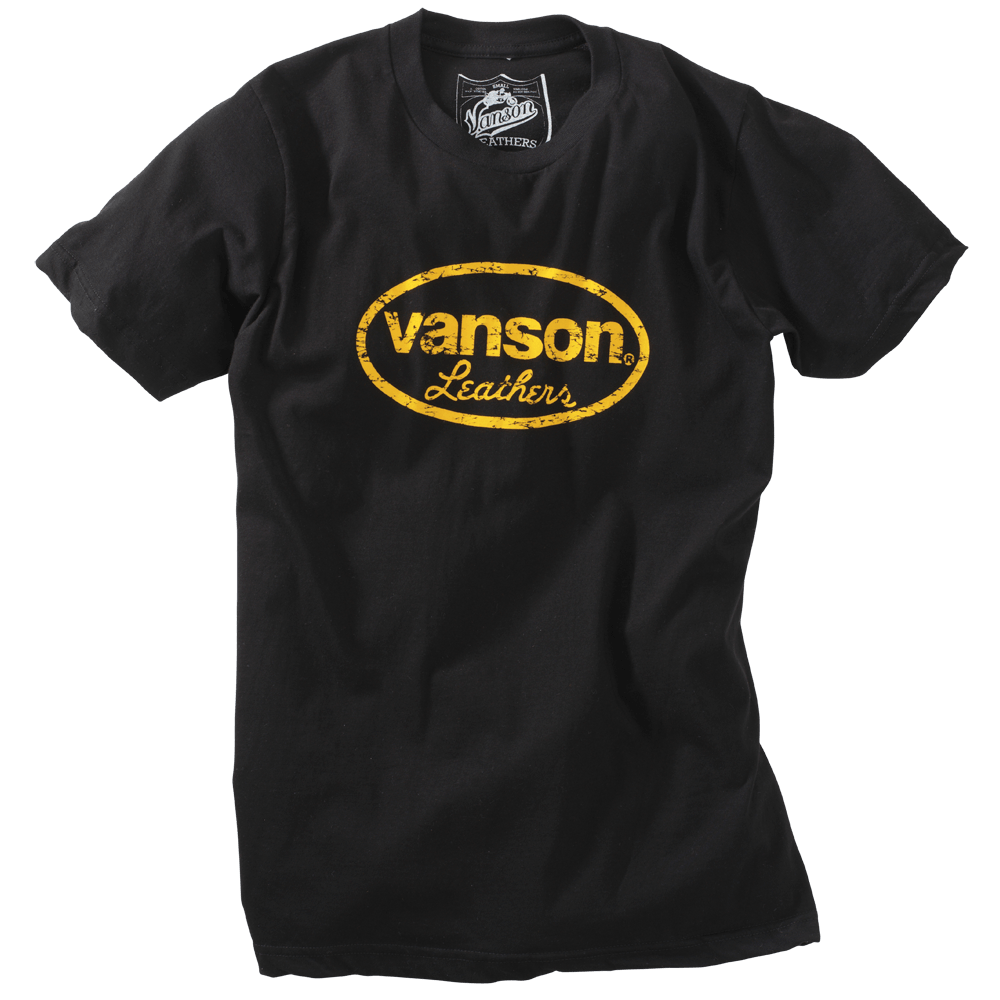 Screened on the front is a distressed Vanson Competition Oval. This black T-shirt with the classic yellow Vanson logo is exceptionally soft, comfortable, slim fitting... and made in the USA. Great to wear when you need de-stressing.