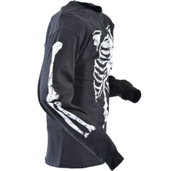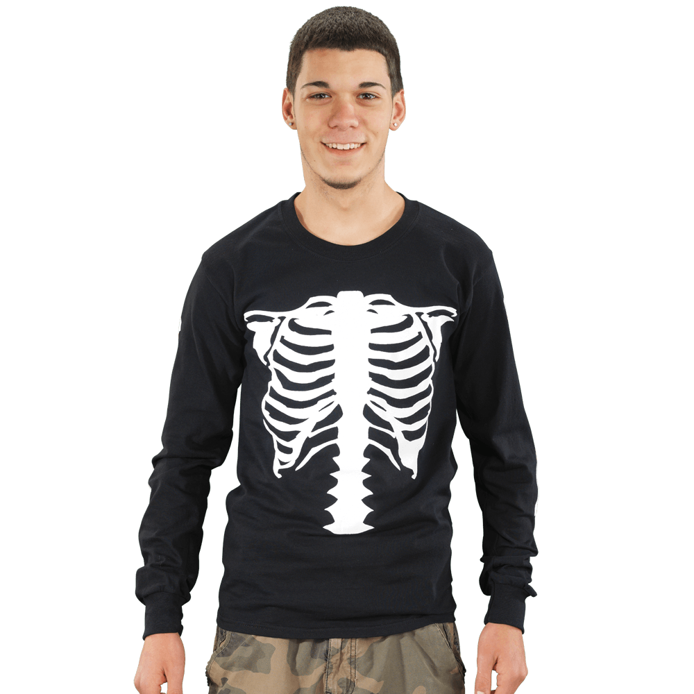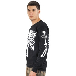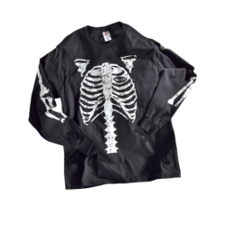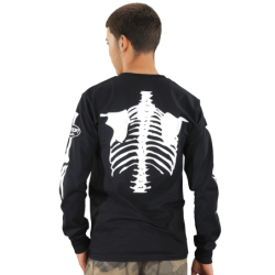 a big, black beefy long-sleeved T-shirt with a Skeleton print on the front, back, and arms. And a Vanson Competition Oval on the left shoulder. Do you have the bones to wear one?