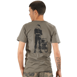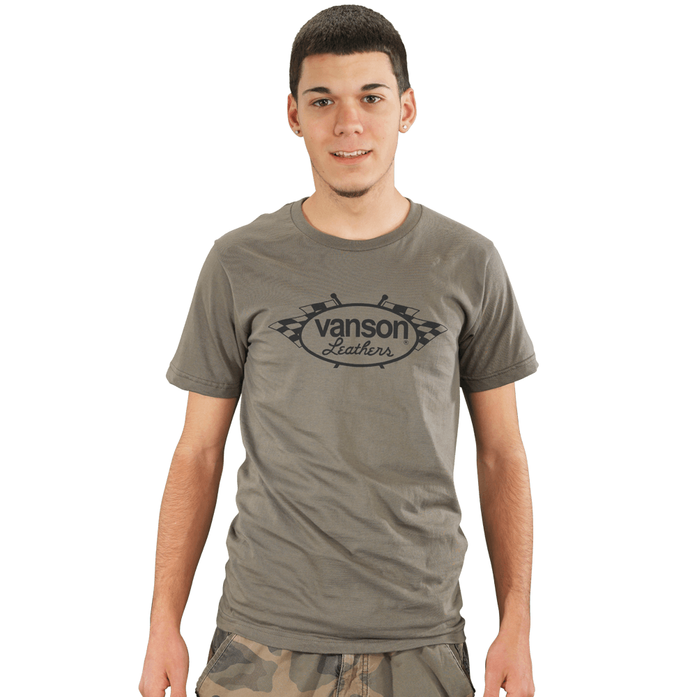 Our Rider Silhouette T-shirt shows an image of a rider on the back with the classic Vanson oval and checkered flags on the front.