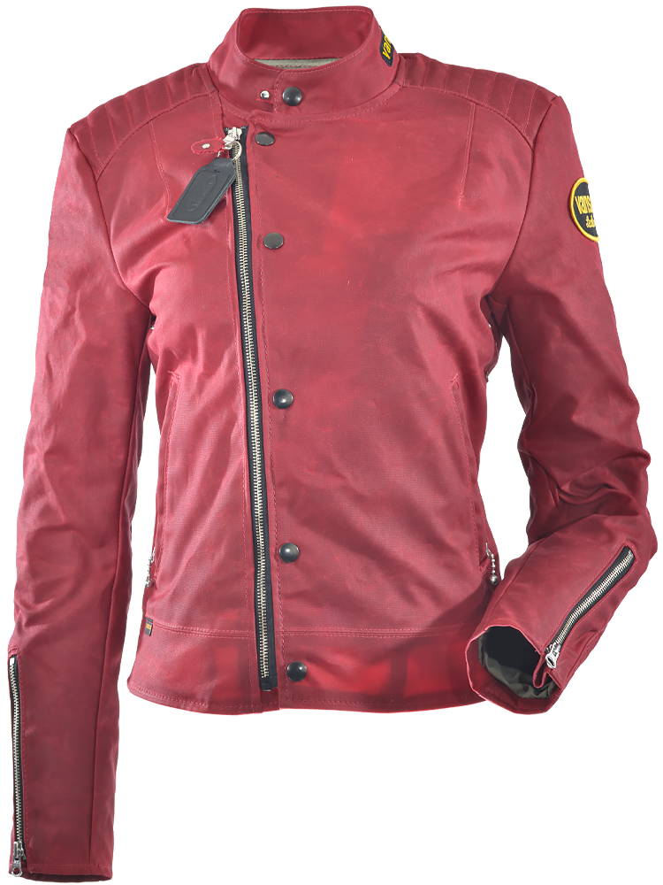 The Vanson Leathers MOTA Jacket/Ladies (Model 5005 A650) is a bold women’s motorcycle jacket crafted from durable Army 1010 Glory Red wax cotton canvas.