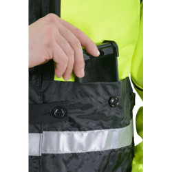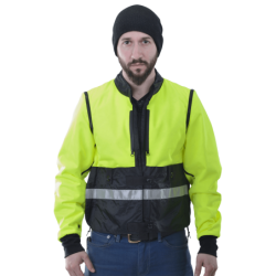 It is night, you are on Route 3, a busy road, some shoulder, and you have a flat tire. You take your Streamliner off, reverse it so the safety hi-vis lining and reflective strips show in the headlights of oncoming traffic. Because the Streamliner is designed to be fully reversible you can zip close the front zipper and windflap system either the reflective hi-vis side or the four pocket front side out. In one of the two zip-closed chest pockets you have an LED flashlight...