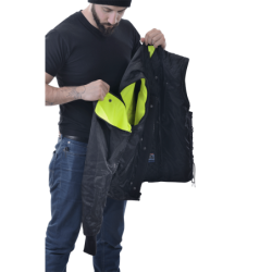 You get to the show and people are noticing your vest. The shoulder padding is obviously hand quilted and top stitched. The front looks all business with the four pockets and hand quilted wind-proof applied windflap. So you give in and show the admirers the hi-vis inside lining with the reflective material worked into the custom embroidery design... The trick Media Pocket with wire pass-through in the upper left chest area gets a special mention. Neat zip-off sleeve-storage pockets, air gauge and pen holder strip, and the twin inner large capacity storage pockets round out the tour. What you did not show them is the secret pocket-in-a-pocket feature in which you have your stash...