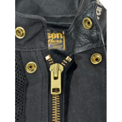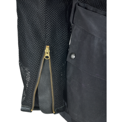 BLACK CORDURA 1000 DENIER HEAVY DUTY MESH + BLACK ARMY DUCK 1010 WAX COTTON are combined to create a unique hybrid jacket ideal for hot weather riding. The Cordura mesh is very strong and abrasion-resistant while also allowing maximum airflow. V150 BLACK HEAVY-DUTY VENT MESH High-tenacity 1000 denier nylon yarn is used to knit this mesh material. It is finished with a bonding treatment that enhances the strength of the material. You can feel this in the hardness of the material to the touch . ARMY DUCK 1010 ( 10 oz. ) BLACK Waxed Cotton Wax cotton combines breathability with water repellency which make the material very comfortable in a wide range of conditions. Wax cotton can be reconditioned and re-proofed using the Vanson wax sold separately. Use a hair dryer to heat the area of the garment needing wax + work the wax paste into the Duck using a dry cloth and a circular motion. Note: Do not wash or dry-clean this garment as it will harm both the coating on the Cordura and the wax in the wax cotton. To clean this garment simply hose off with cool water and air-dry in a cool place.