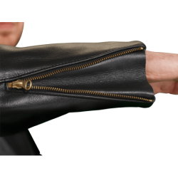 AR2-front-backTo prevent wind from billowing the jacket around the waist, we extended the back until it almost touched the seat of the bike. To give the jacket a snug, wind-tight fit around the torso, we shaped the jackets sides so they would curve over the riders thighs. Then, to keep the jacket from pushing up into the throat while riding, we shortened the front. To increase wind protection without adding bulk and still maintaining a good collar height, we lined the collar with long-lasting rayon. Then, to allow the collar to either be fully sealed or snapped open, without anything loose flapping in the wind, we extended the collar and added snaps. For further wind protection without bulk, we added a full-length, rayon-lined wind flap. Then, by extending the front zipper up to the neckline and capping it with the collar, we eliminated air leaks. We started the zipper a few inches up from the bottom, so the jacket would splay out slightly, increasing comfort for the rider. Next we looked at the reach, and the need to keep the body of the jacket snug, while allowing easy movement with different layers of clothing. So we redesigned the action back with three internal bands of elastic to hold its shape and pull it back into place. We added matching inside pleats to keep the lining floating in the jacket, so as not to impede movement or reach. 1975 ad cardTo reach the bars more easily we biased the sleeves forward at the armholes and added underarm gussets. The wrists got particular attention - as most sleeve ends are fully lined the sleeve ends become bulky when the wrist zippers are closed. So we invented a way to sew the lining around the wrist gusset edges for the unlined wrist gusset to fold away when the wrist zippers are closed. From our many years of repair experience, we knew that anti-wear cuffs inside the sleeves would keep the lining from fraying at points of contact so we created all-leather sleeve ends turned up to prevent wear. Then we folded and shaped the leather into the turnead up position so a lining repair or alteration would not leave any visible needle holes. Last but not least, we built the jacket with wide, substantial inside leather facings for anchoring the inside pocket and keeping the lining away from predictable wear points.