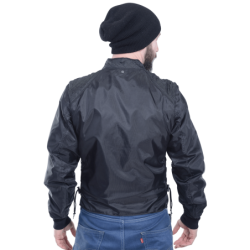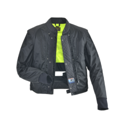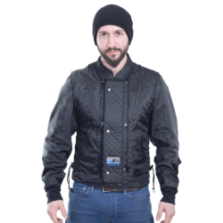 First Vanson is using a proprietary blend of soft structure high-density polyethylene quilted to 4.3 oz polyester knit. This mix allows wicking and helps create dead air spaces. Then we insert this assembly into a 200 denier nylon that has been sealed at the textile mill with polyurethane for water resistance, wind-proofness, and strength. This sandwich of materials makes for a very thin, lightweight, wind-proof garment ideal for use in a high wind environment such as motorycling.