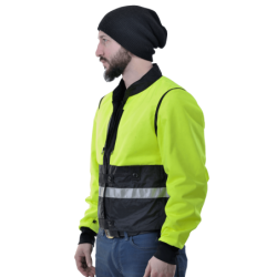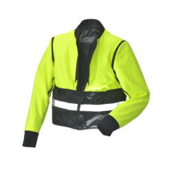 It is night, you are on Route 3, a busy road, some shoulder, and you have a flat tire. You take your Streamliner off, reverse it so the safety hi-vis lining and reflective strips show in the headlights of oncoming traffic. Because the Streamliner is designed to be fully reversible you can zip close the front zipper and windflap system either the reflective hi-vis side or the four pocket front side out. In one of the two zip-closed chest pockets you have an LED flashlight...