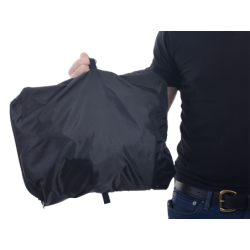 You get to the show and people are noticing your vest. The shoulder padding is obviously hand quilted and top stitched. The front looks all business with the four pockets and hand quilted wind-proof applied windflap. So you give in and show the admirers the hi-vis inside lining with the reflective material worked into the custom embroidery design... The trick Media Pocket with wire pass-through in the upper left chest area gets a special mention. Neat zip-off sleeve-storage pockets, air gauge and pen holder strip, and the twin inner large capacity storage pockets round out the tour. What you did not show them is the secret pocket-in-a-pocket feature in which you have your stash...