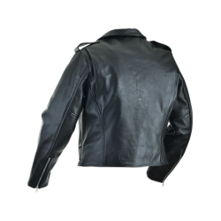 Good for a night out with friends, too. Beautifully cut with a huge one piece back no seams, no tiny little pieces puzzled together to save leather. Big generous front panels too. This jacket is cut and built in the old way, which would be called uneconomic today, but we call No Compromises. Full-size 2" wide half belts sewn into the side seams, with a big polished nickel-plated solid brass buckle to keep the waist snug. Available in both competition-weight and medium-weight cowhide. With zippered hand pockets, a zippered glove pocket, even a snap-close cigarette/ cellphone pocket, and classic chrome hardware throughout. Hand built in America. Destined to become a prized heirloom. In a word, Thunderbird!